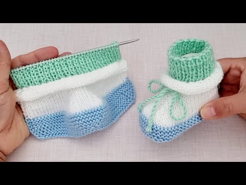 Tekli Pirinç Desen İki Şiş Gömlek Yaka Bebek Patiği Yapılışı ❣ Easy Knitting Baby Boo...